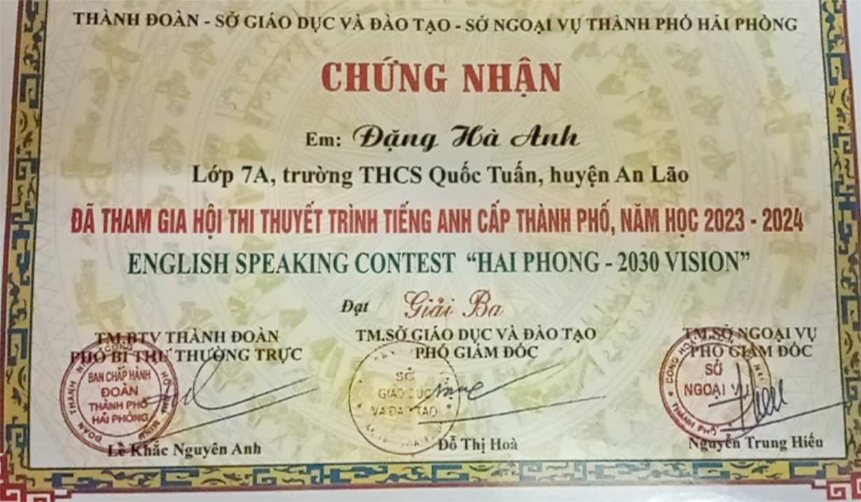 Sáng nay, ngày 14/01/2024, thực hiện Kế hoạch số 120/KH-UBND ngày 14/4/2023 của Ủy ban nhân dân thành phố về thực hiện Chương trình “ Hỗ trợ nâng cao năng lực ngoại ngữ và hội nhập quốc tế cho thanh thiếu nhi Việt Nam giai đoạn 2022-2030”, em Đặng Hà Anh lớp 7A đại diện cho học sinh toàn trường tham gia hội thi. Em đã tự tin hoàn thành xuất sắc bài thuyết trình của mình. Sau đây là một số hình ảnh: