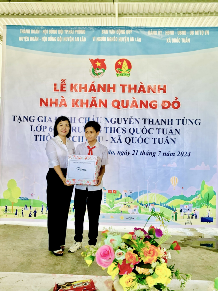 Thực hiện Chương trình công tác Đoàn - Hội - Đội và phong trào thanh thiếu nhi; Hưởng ứng cuộc vận động “Vì đàn em thân yêu”, sáng 21/07/2024, Đoàn - Hội - Đội thành phố chỉ đạo Đoàn - Hội - Đội huyện An Lão phối hợp với Đảng uỷ - UBND xã Quốc Tuấn, TrườngTHCS Quốc Tuấn tổ chức chương trình Khánh thành xây dựng Nhà khăn quàng đỏ cho gia đình em Nguyễn Thanh Tùng- Lớp 6C-Trường THCS Quốc Tuấn, tại thôn Bạch Câu thuộc diện gia đình khó khăn trên địa bàn xã.