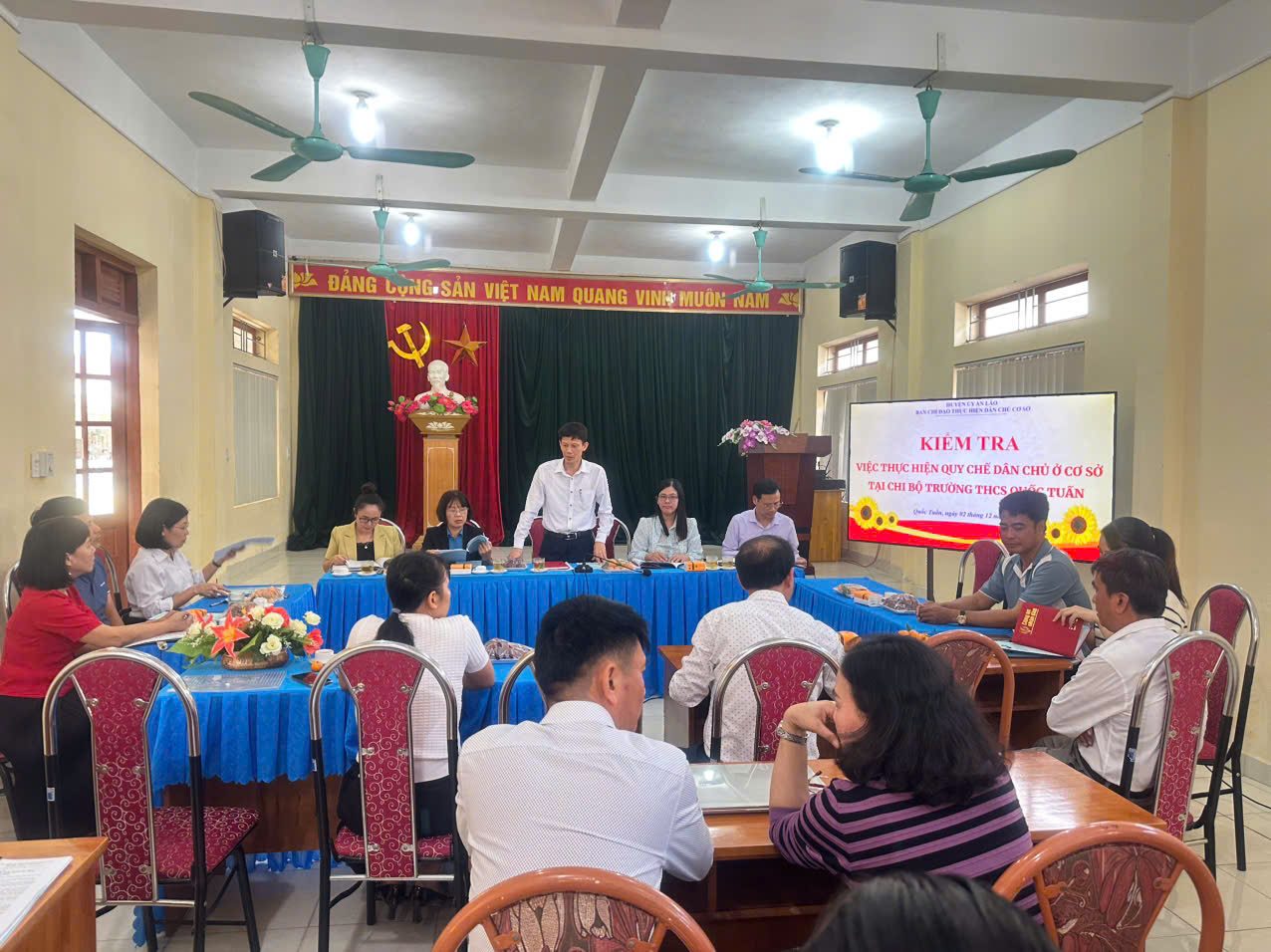 Thực hiện Quyết định số 27- QĐ/BCĐ ngày 05/11/2024 của Ban Chỉ đạo xây dựng và thực hiện Quy chế dân chủ ở cơ sở huyện An Lão về việc kiểm tra việc thực hiện dân chủ ở cơ sở, chiều ngày 02/12/2024, đồng chí Nguyễn Văn Quang – Ủy viên ban thường vụ Huyện ủy, Trưởng ban dân vận Huyện ủy, Phó Trưởng ban thường trực Ban chỉ đạo thực hiện Quy chế dân chủ (QCDC) Huyện An Lão chủ trì buổi kiểm tra việc thực hiện QCDC ở cơ sở tại chi bộ trường THCS Quốc Tuấn. Cùng tham dự buổi kiểm tra có các đồng chí trong Ban chỉ đạo thực hiện Quy chế dân chủ của Huyện; các đồng chí đại diện Lãnh đạo địa phương.