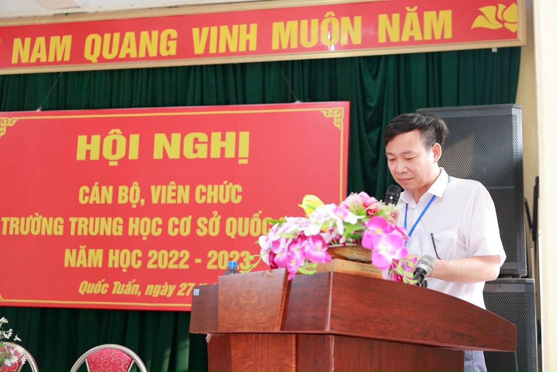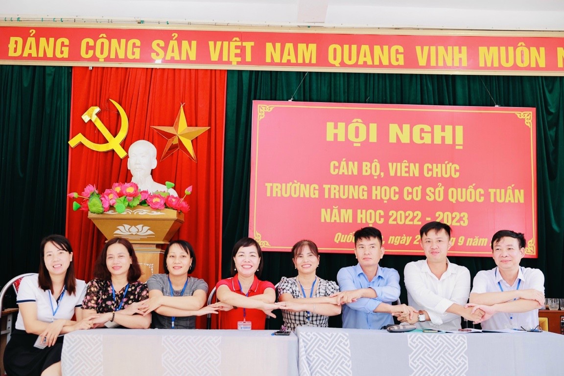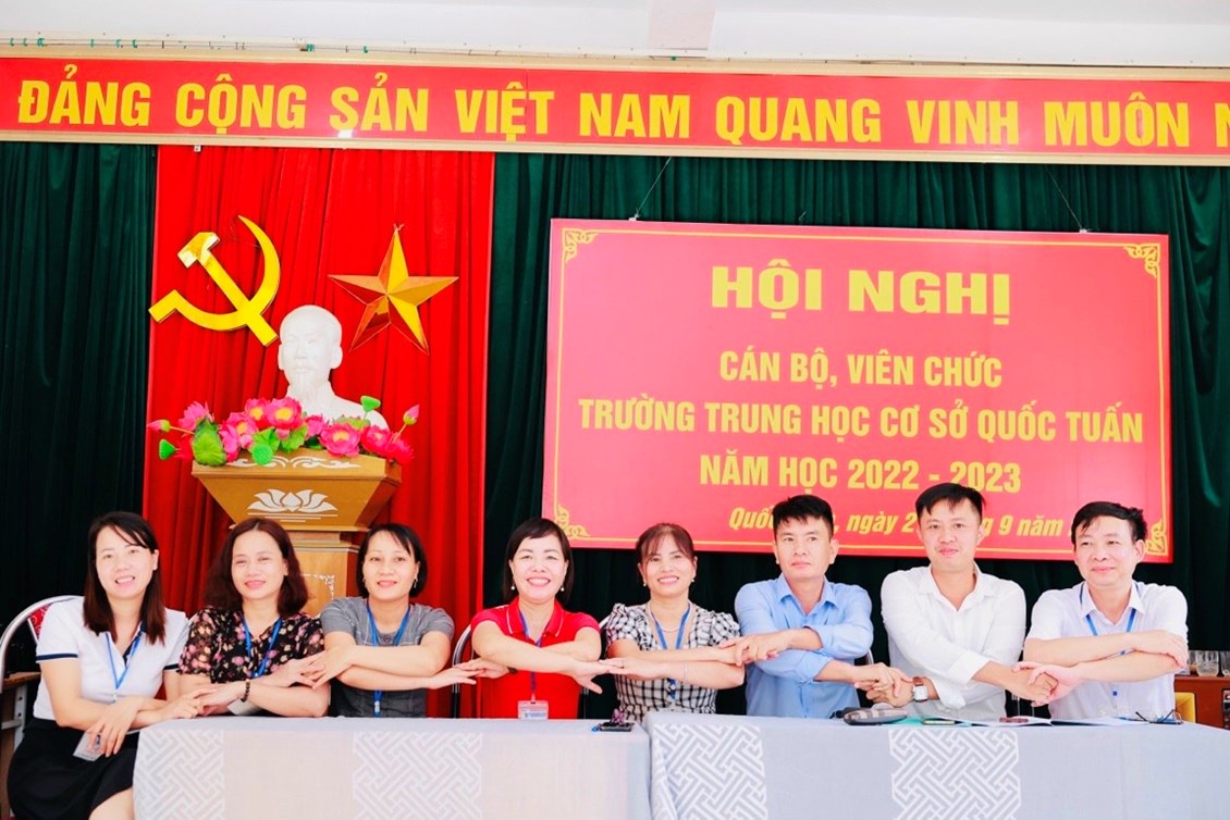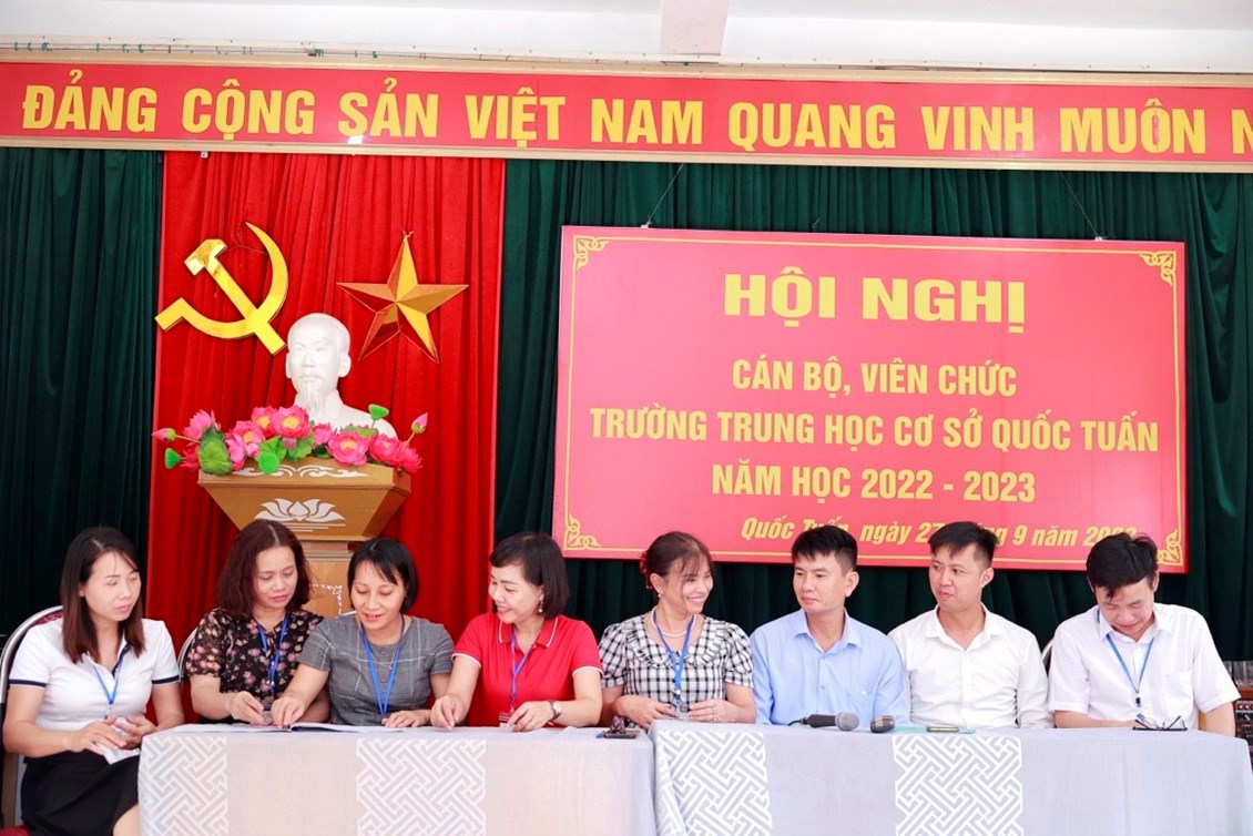 Hội nghị cán bộ, viên chức trường THCS Quốc Tuấn được tổ chức vào sáng ngày 27/9/2022. Về dự và chỉ đạo hội nghị có các đồng chí lãnh đạo, chuyên viên Liên đoàn lao động huyện, Ban dân vận, Phòng Giáo dục và Đào tạo huyện An Lão; các đồng chí đại diện chính quyền địa phương xã Quốc Tuấn; Ban đại diện cha mẹ học sinh trường. Hội nghị đã kêu gọi toàn thể CB, VC cơ quan tăng cường đoàn kết trên cơ sở thực hiện tốt Quy chế dân chủ cơ sở; phát huy sức mạnh, trí tuệ tập thể, tích cực hưởng ứng phong trào thi đua do Thủ trưởng cơ quan và BCH công đoàn phát động, phấn đấu hoàn thành thắng lợi các nhiệm vụ, chỉ tiêu do Hội nghị đã đề ra.