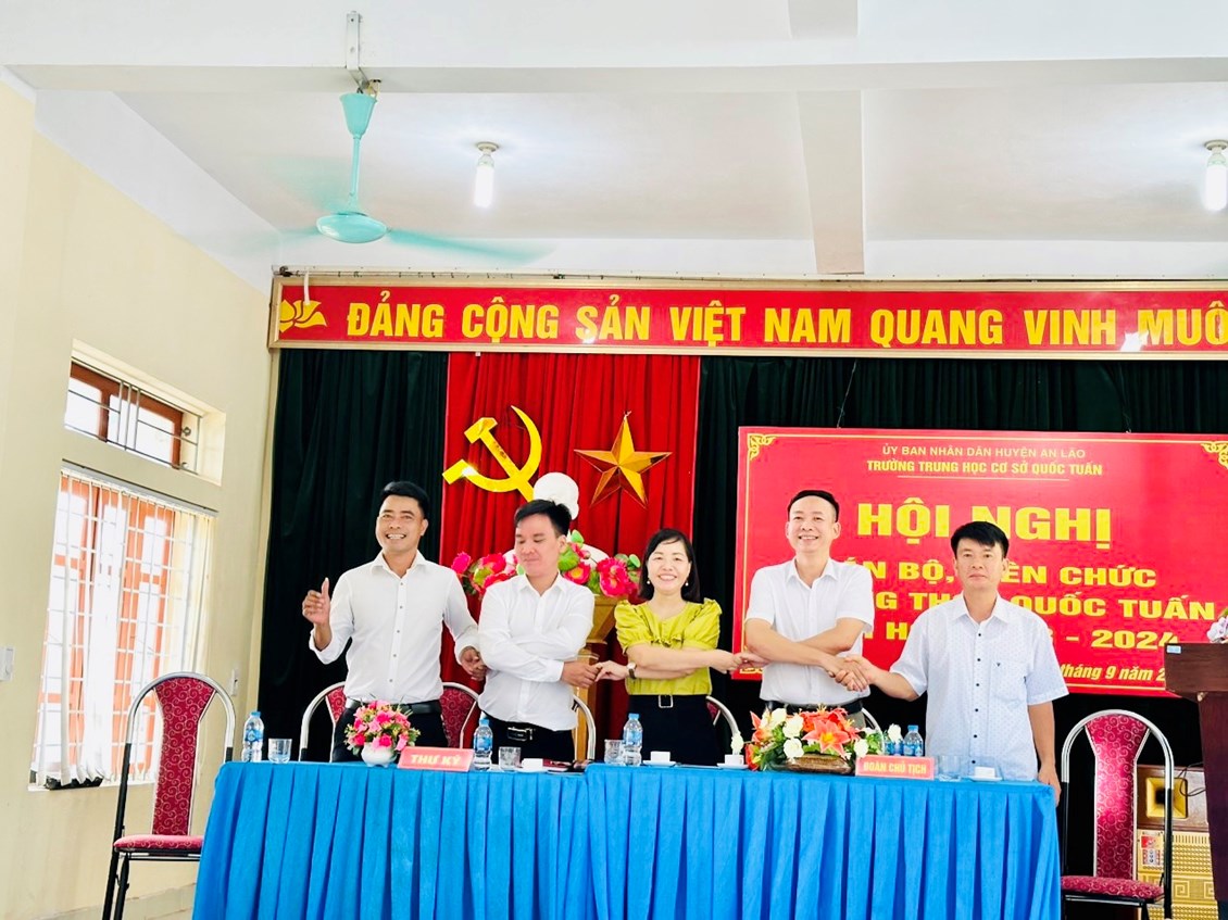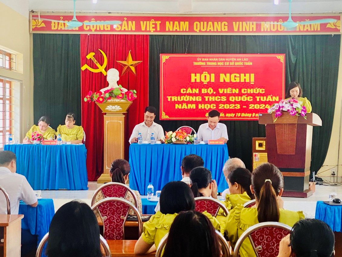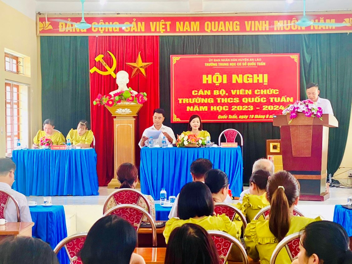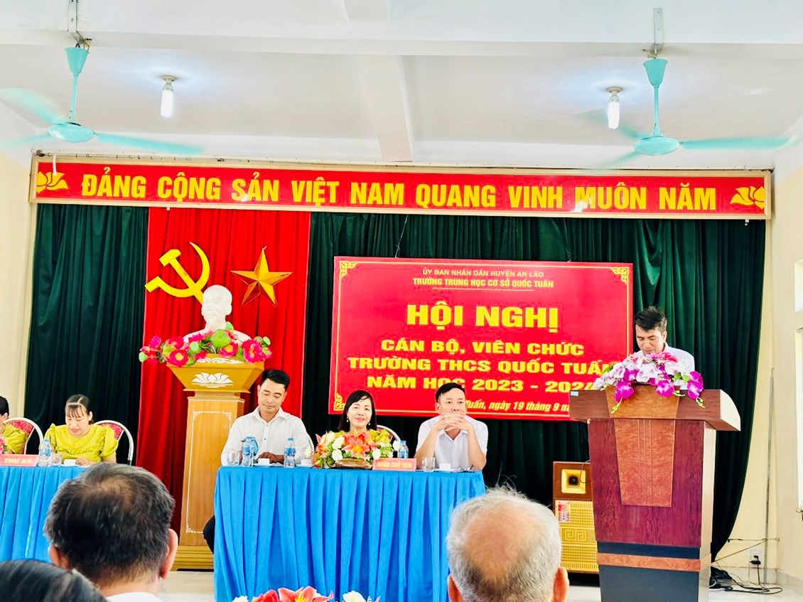 Hòa trong không khí tưng bừng, phấn khởi của những ngày đầu năm học mới 2023- 2024, chiều ngày 19/09/2023, trường THCS Quốc Tuấn long trọng tổ chức Hội nghị cán bộ , viên chức. Về dự hội nghị có các đồng chí đại diện cho chính quyền địa phương , hội khuyến học xã Quốc Tuấn, Ban đại diện cha mẹ học sinh trường... Dựa trên những kết quả , thành tích xuất sắc đã đạt được, Hội nghị đã kêu gọi toàn thể CB,VC, NLĐ cơ quan tăng cường đoàn kết, phát huy sức mạnh tập thể, tích cực hưởng ửng phong trào thi đua do Thủ trưởng cơ quan và BCH công đoàn phát động, phấn đấu hoàn thành xuất sắc các nhiệm vụ, chỉ tiêu mà Hội nghị đã đề ra.