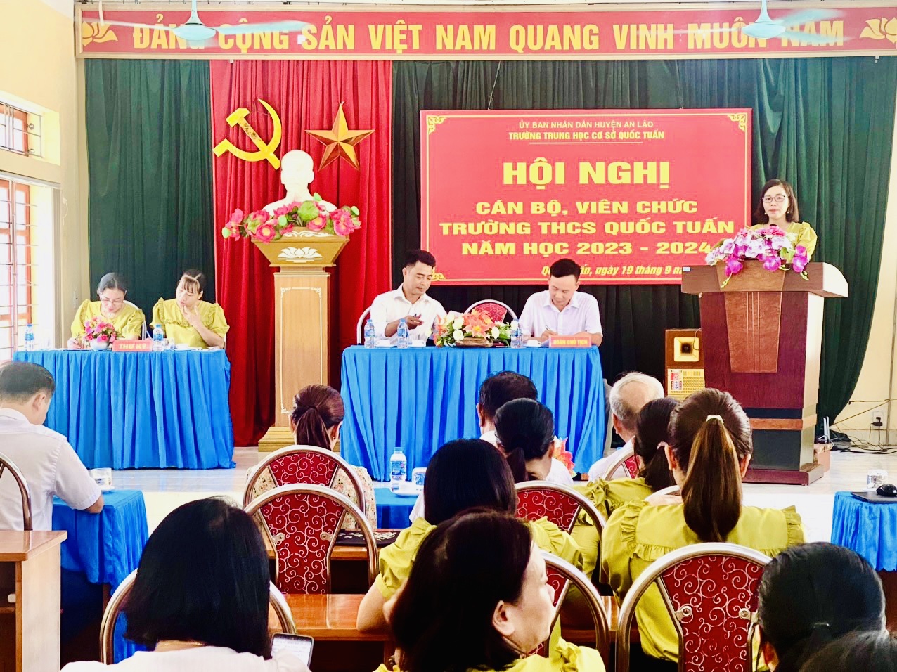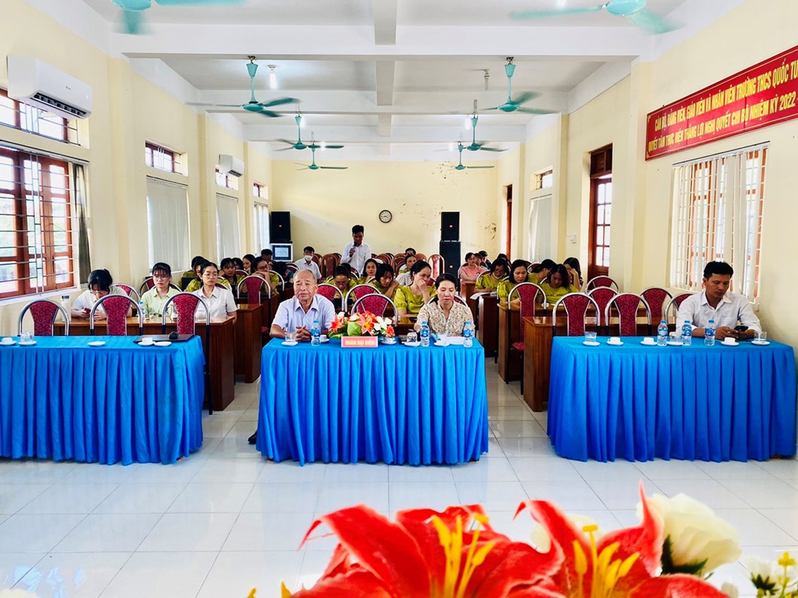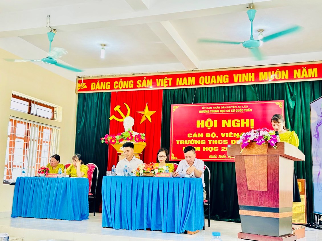 Hòa trong không khí tưng bừng, phấn khởi của những ngày đầu năm học mới 2023- 2024, chiều ngày 19/09/2023, trường THCS Quốc Tuấn long trọng tổ chức Hội nghị cán bộ , viên chức. Về dự hội nghị có các đồng chí đại diện cho chính quyền địa phương , hội khuyến học xã Quốc Tuấn, Ban đại diện cha mẹ học sinh trường... Dựa trên những kết quả , thành tích xuất sắc đã đạt được, Hội nghị đã kêu gọi toàn thể CB,VC, NLĐ cơ quan tăng cường đoàn kết, phát huy sức mạnh tập thể, tích cực hưởng ửng phong trào thi đua do Thủ trưởng cơ quan và BCH công đoàn phát động, phấn đấu hoàn thành xuất sắc các nhiệm vụ, chỉ tiêu mà Hội nghị đã đề ra.
